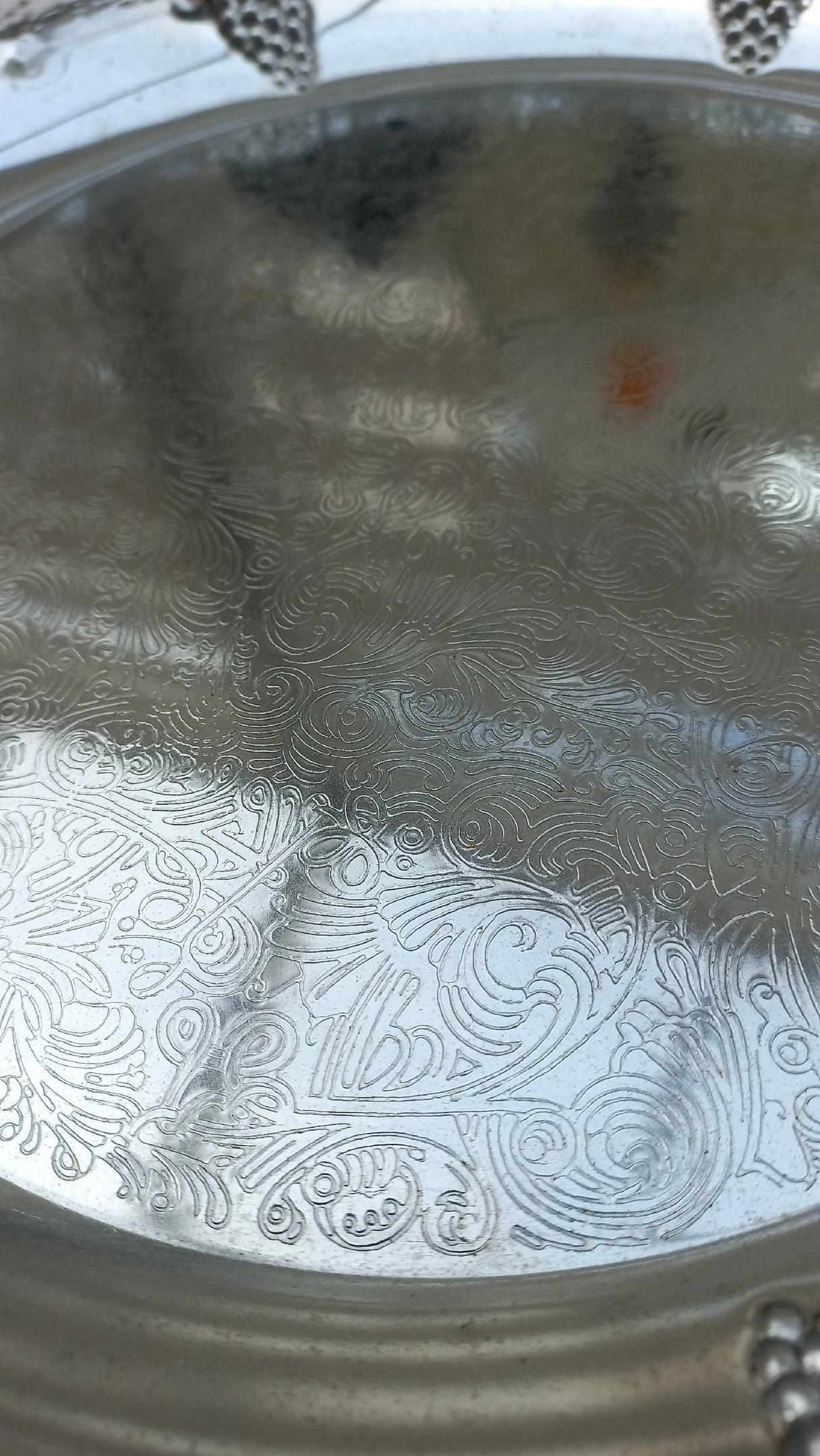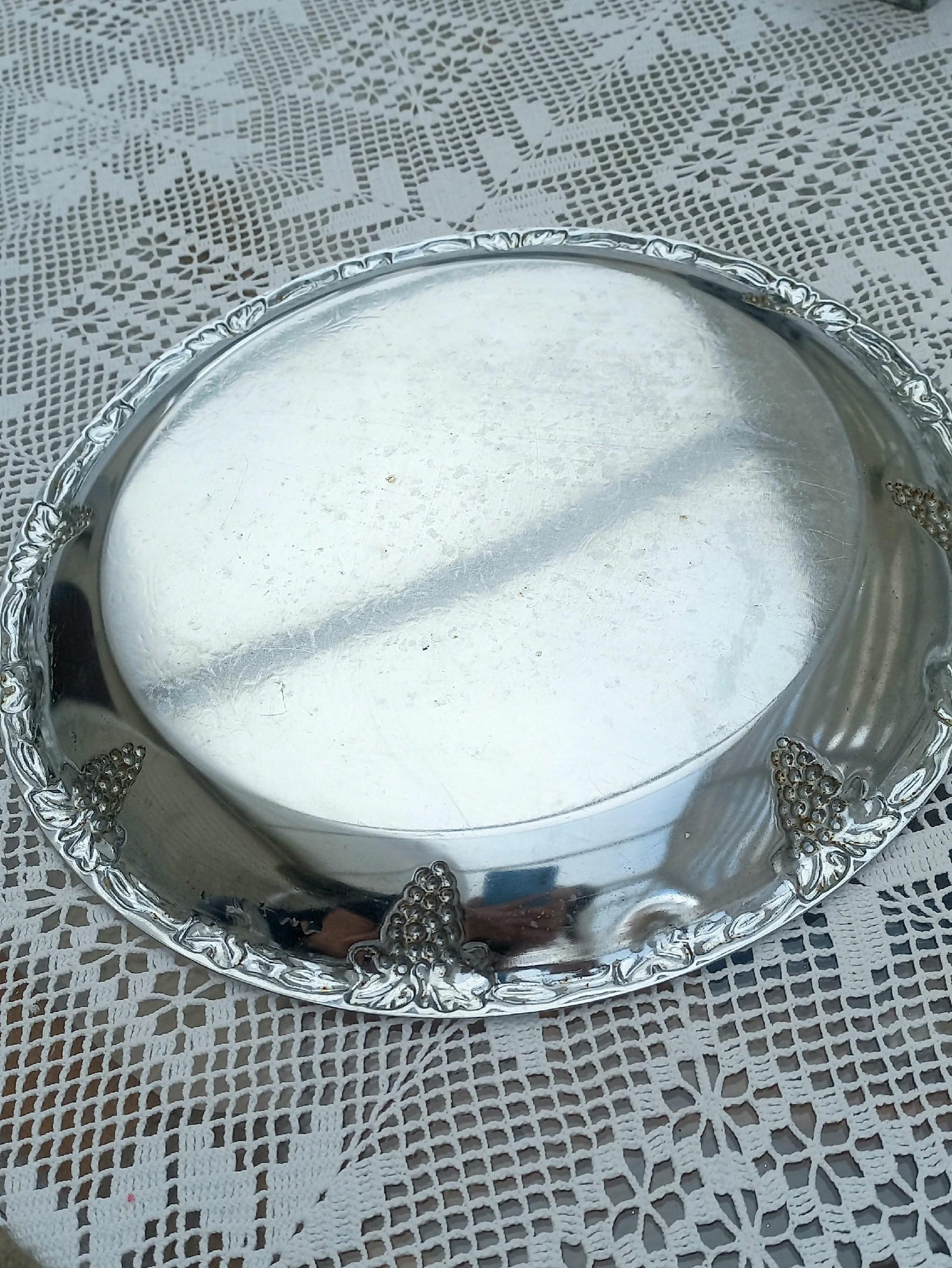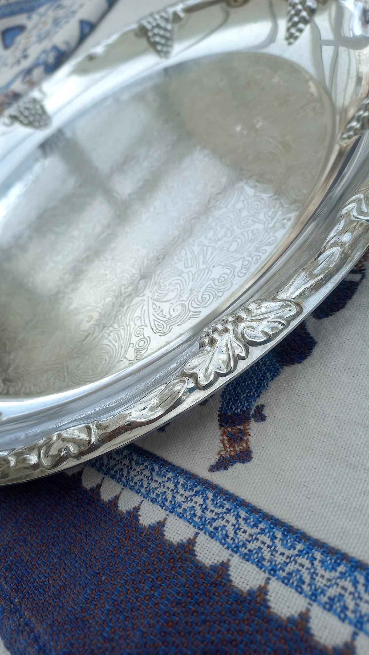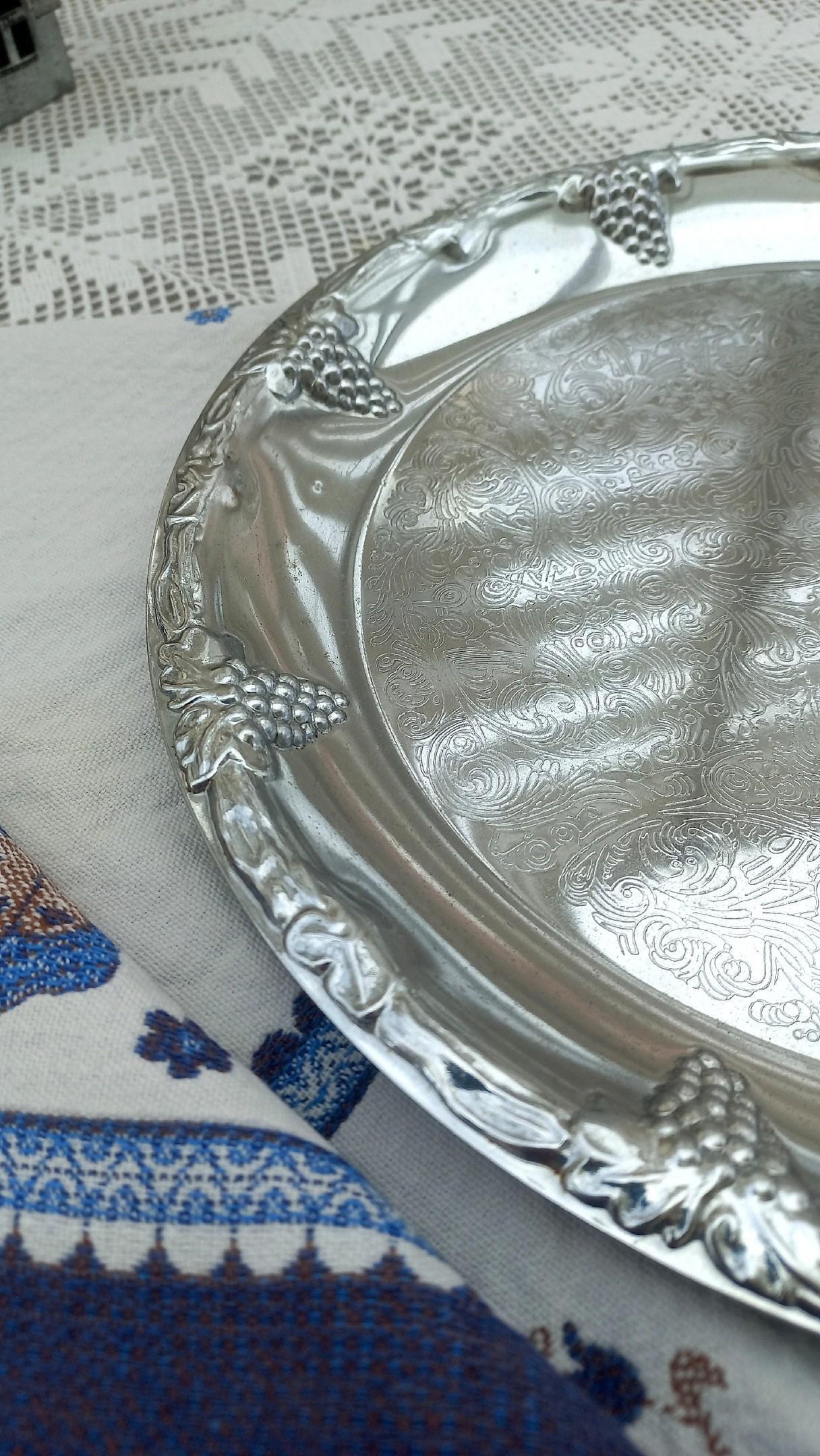 Блюдо имеет рельефный рисунок в виде гроздьев винограда по борту и центральную гравировку.