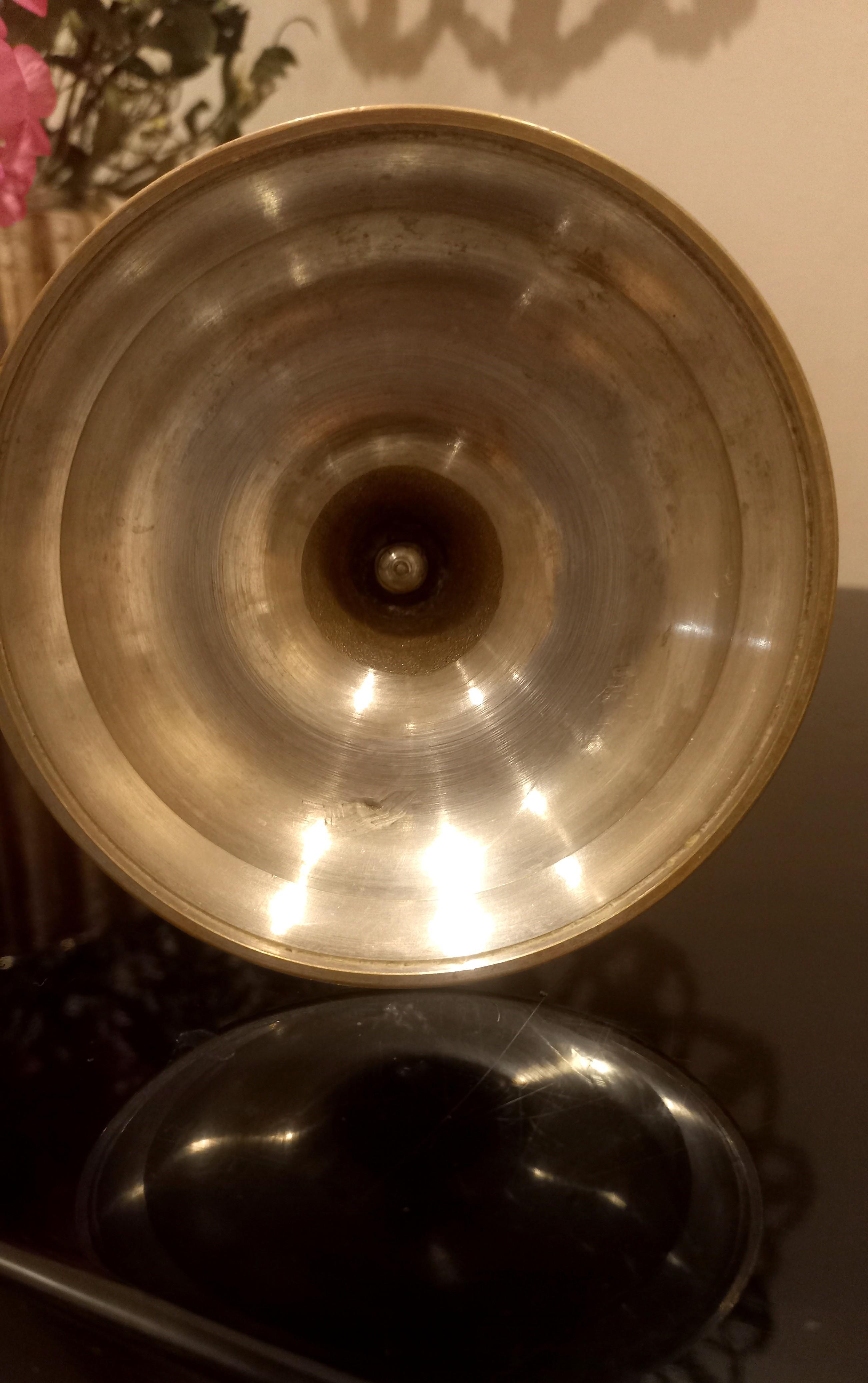Когда-то этот бронзовый подсвечник был покрыт серебром и украшал гостинные состоятельных людей… Серебро можно увидеть лишь на обратной стороне основания, при этом сам подсвечник приобрёл матово- золотистый цвет вперемежку с патиной.